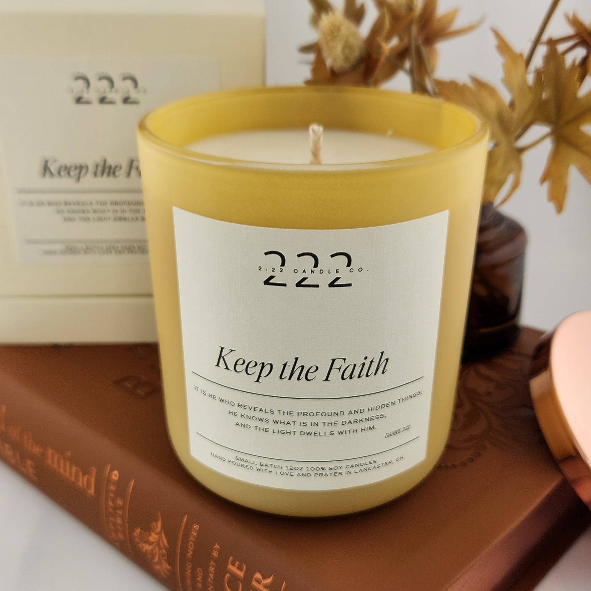 This Candle comes in a 12 oz Vessel with the Keep the Faith Scripture on it.